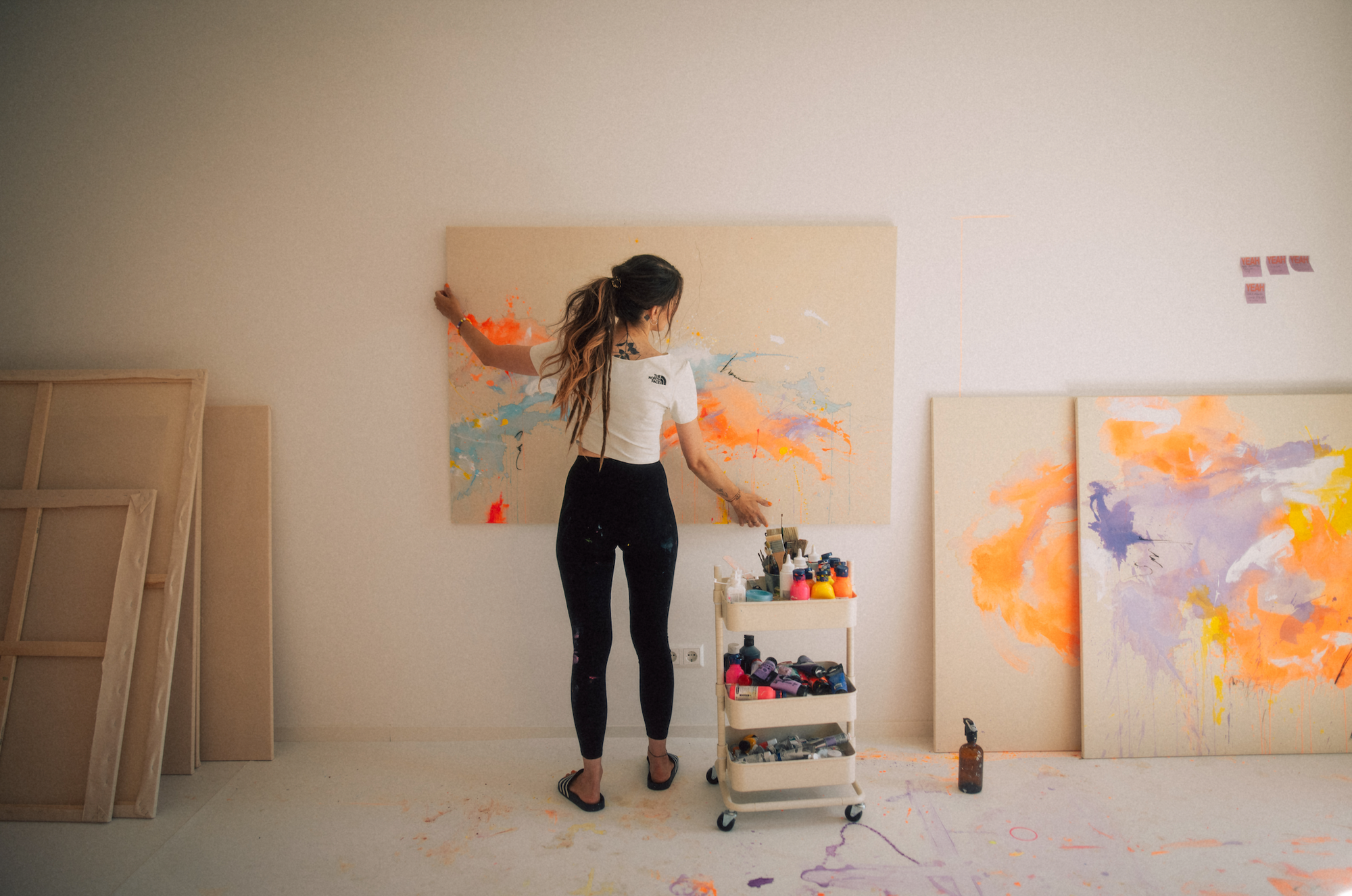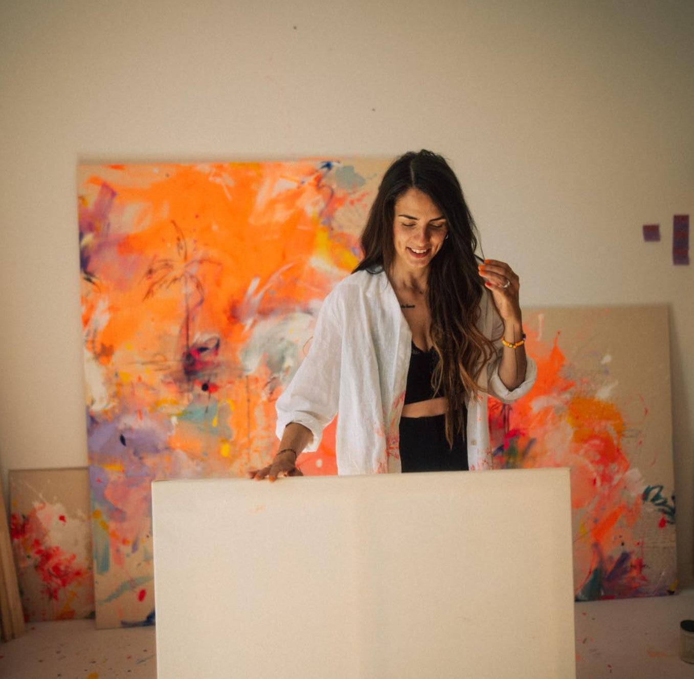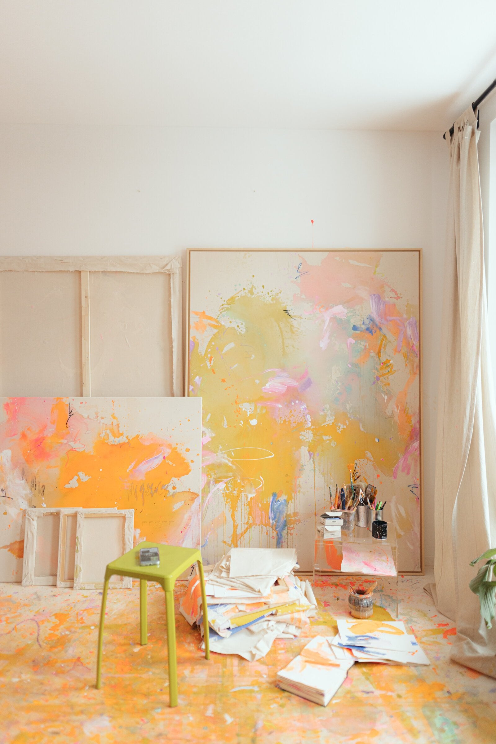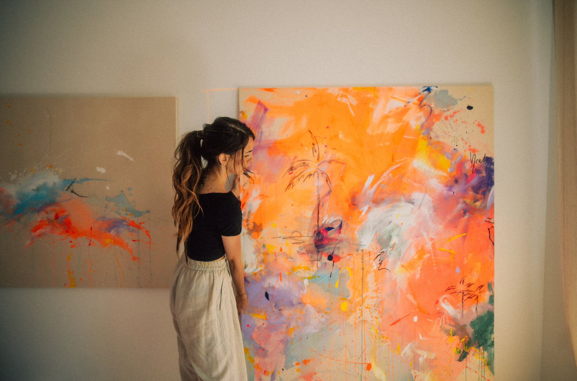 Johanna Marika Thoms is a german artist who’s deeply fallen in love with neon orange. Working with bright colours, charcoal and pastels on raw canvas, she creates contemporary artworks which combine spontaneous and intuitive explosions of colour with compositional harmony and have the power to open up worlds of imagination.
