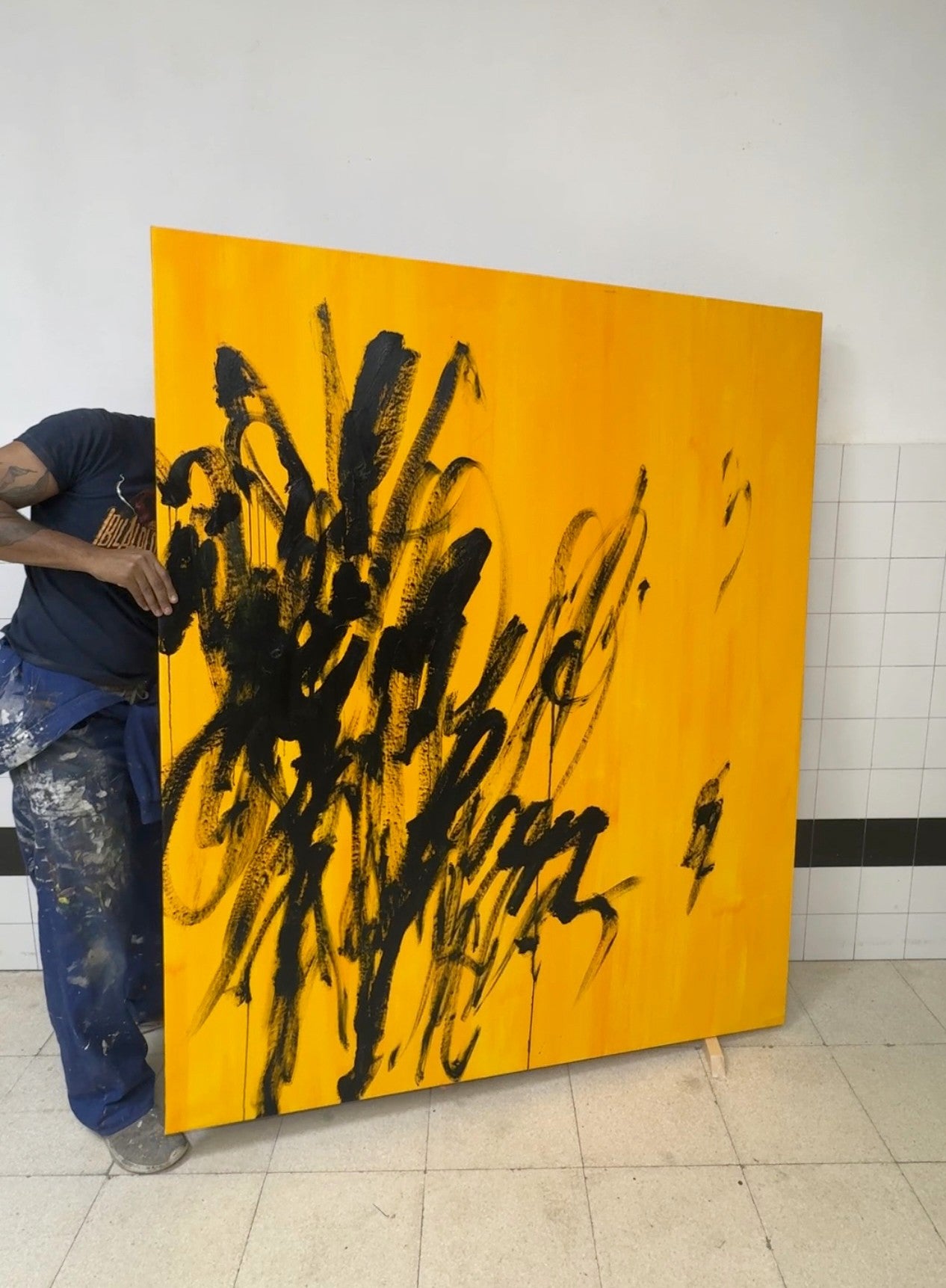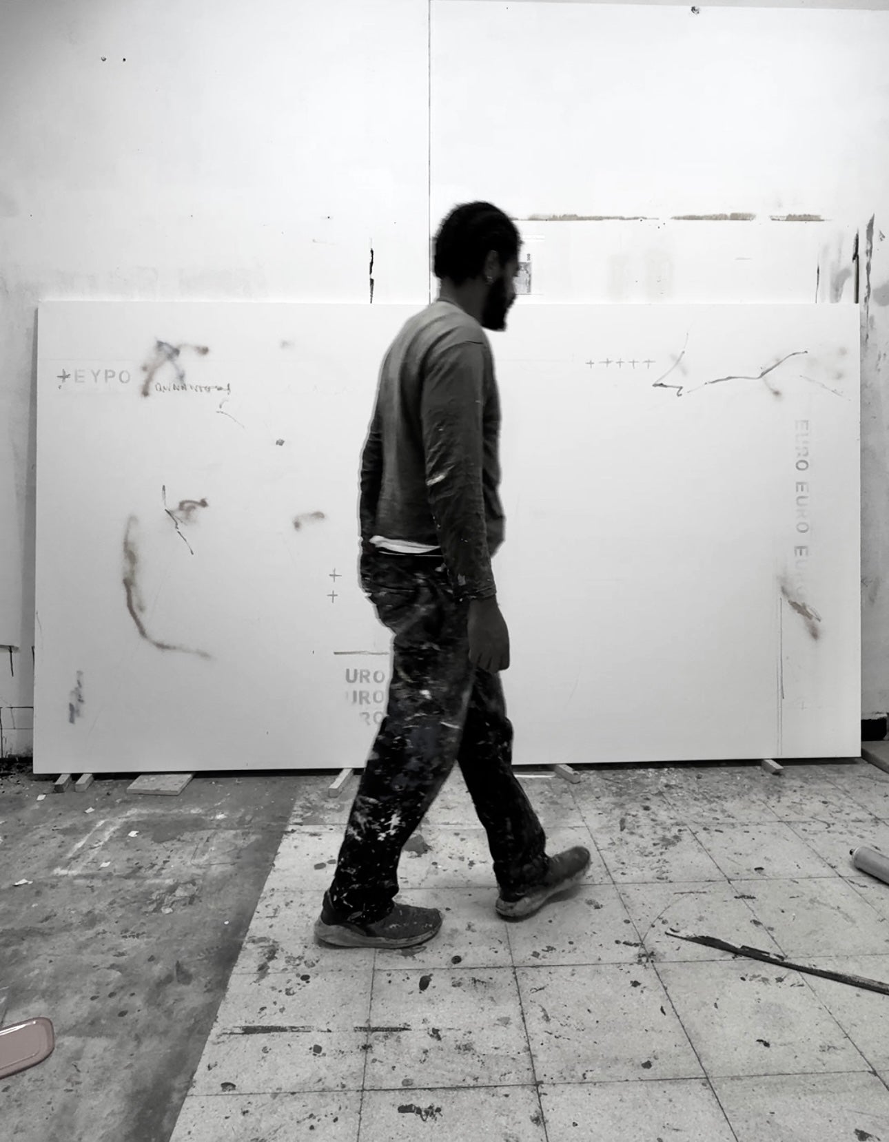Beginning with drawings on paper, he subjects images to multiple digital treatments before translating them back into painterly form. This back-and-forth allows each stage to transform the next, generating friction between the organic and the geometric, as well as between the handmade and the industrial. Rather than resolving these oppositions, his practice embraces instability as an active force.