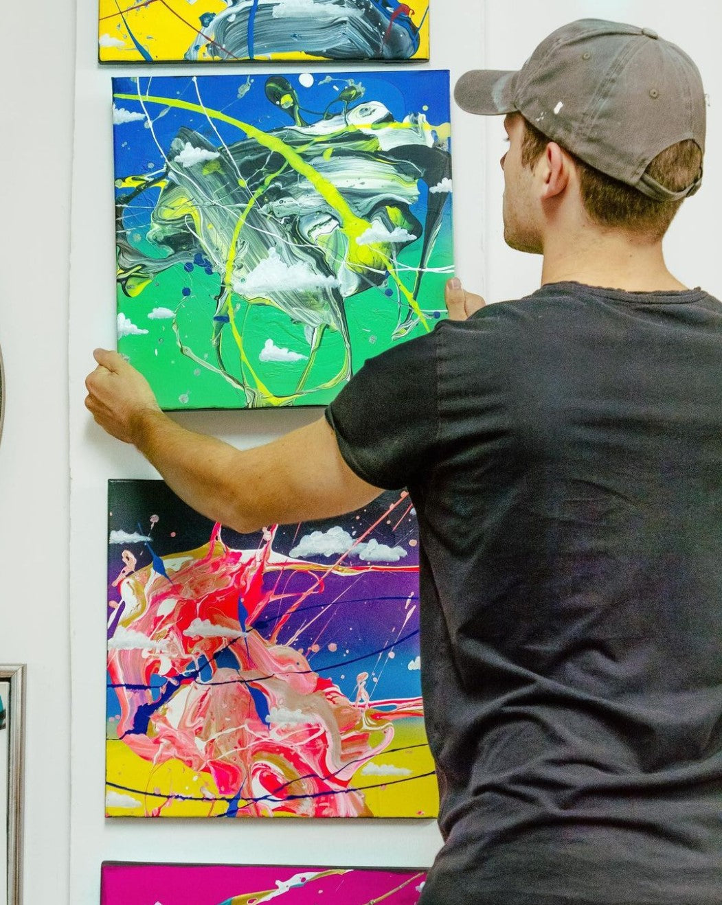 Visually and aesthetically, his works are characterized by a bold, vibrant and expressive style that effortlessly moves along the intersections between abstraction and figuration. Bright, fluorescent colours explode on psychedelic gradients. Chromatic, neon or iridescent tones come in dialogue with disruptive rainbow patterns . Big bursts of hypercolor are layered with various dynamic techniques, creating a mesmerising visual overload.