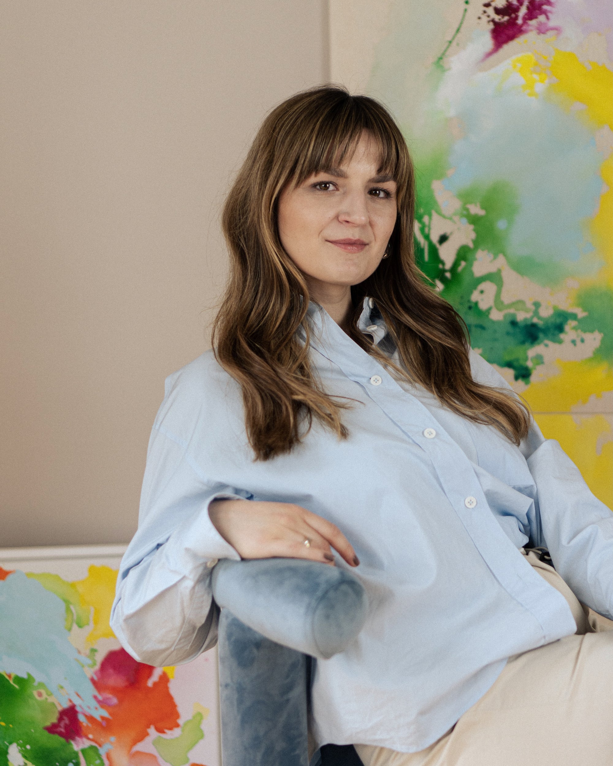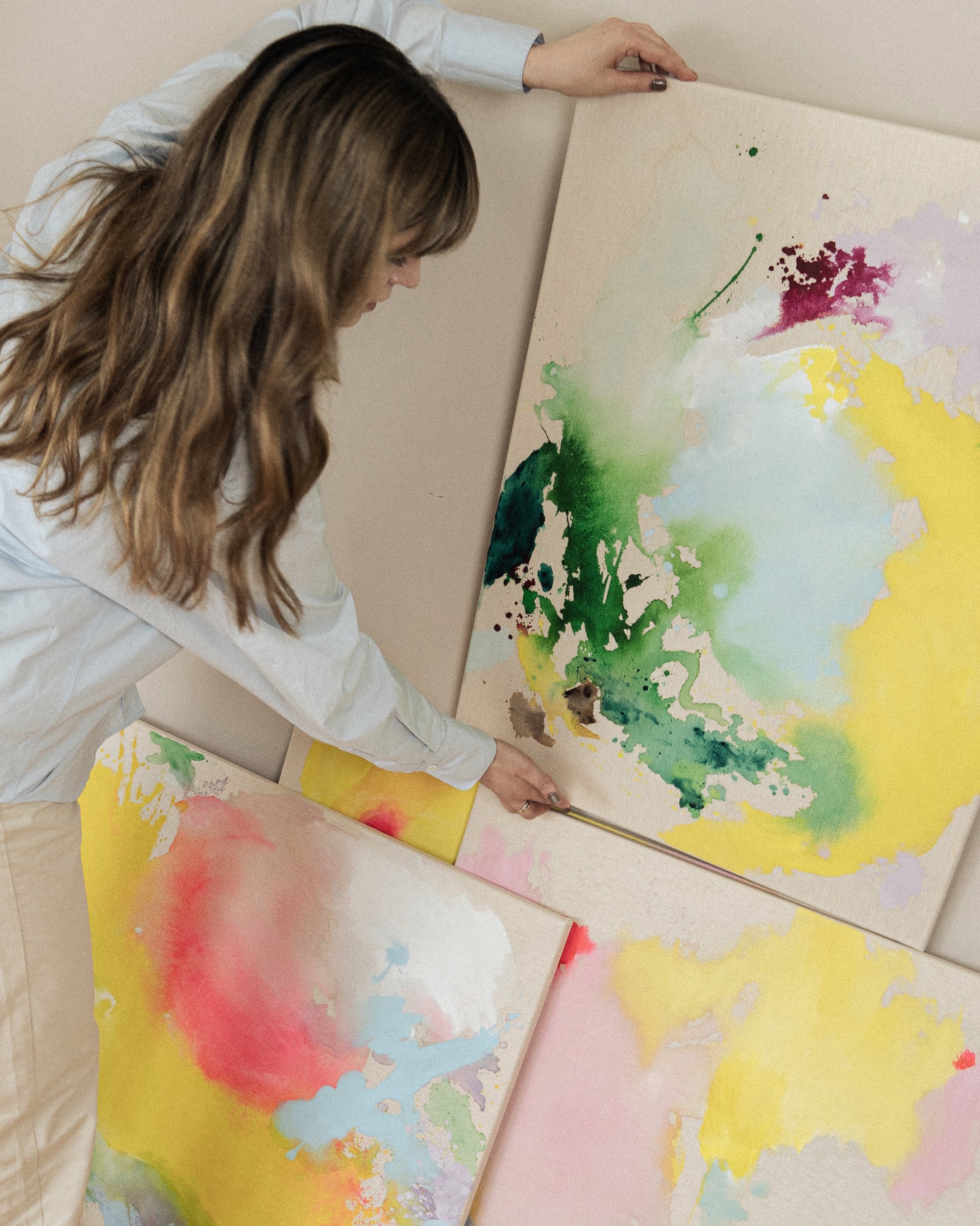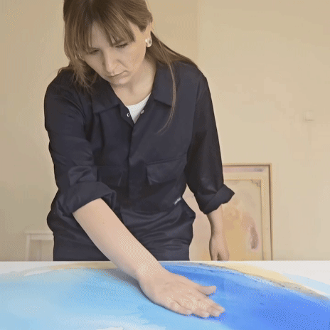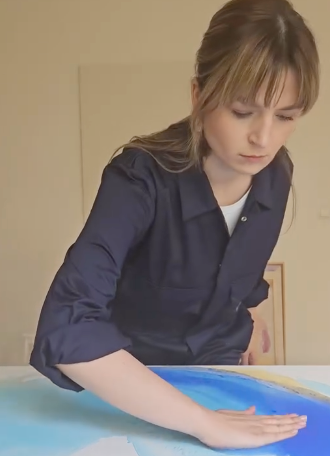 So, her works are her unique voice to what the artist calls “postmodern enlightenment”: The ability to unmask everyday injustices and structures without willing to build up new ones – so that one can find one’s true worth and true connections to others as well as the environment we live in. Her art is an invitation to the viewer to immerse into that world, where sensitivity, elegance and true humanity touch us. Just like the artists’ hands repeatedly touch the canvas. Which is why she mainly uses her pure hands during the painting process.