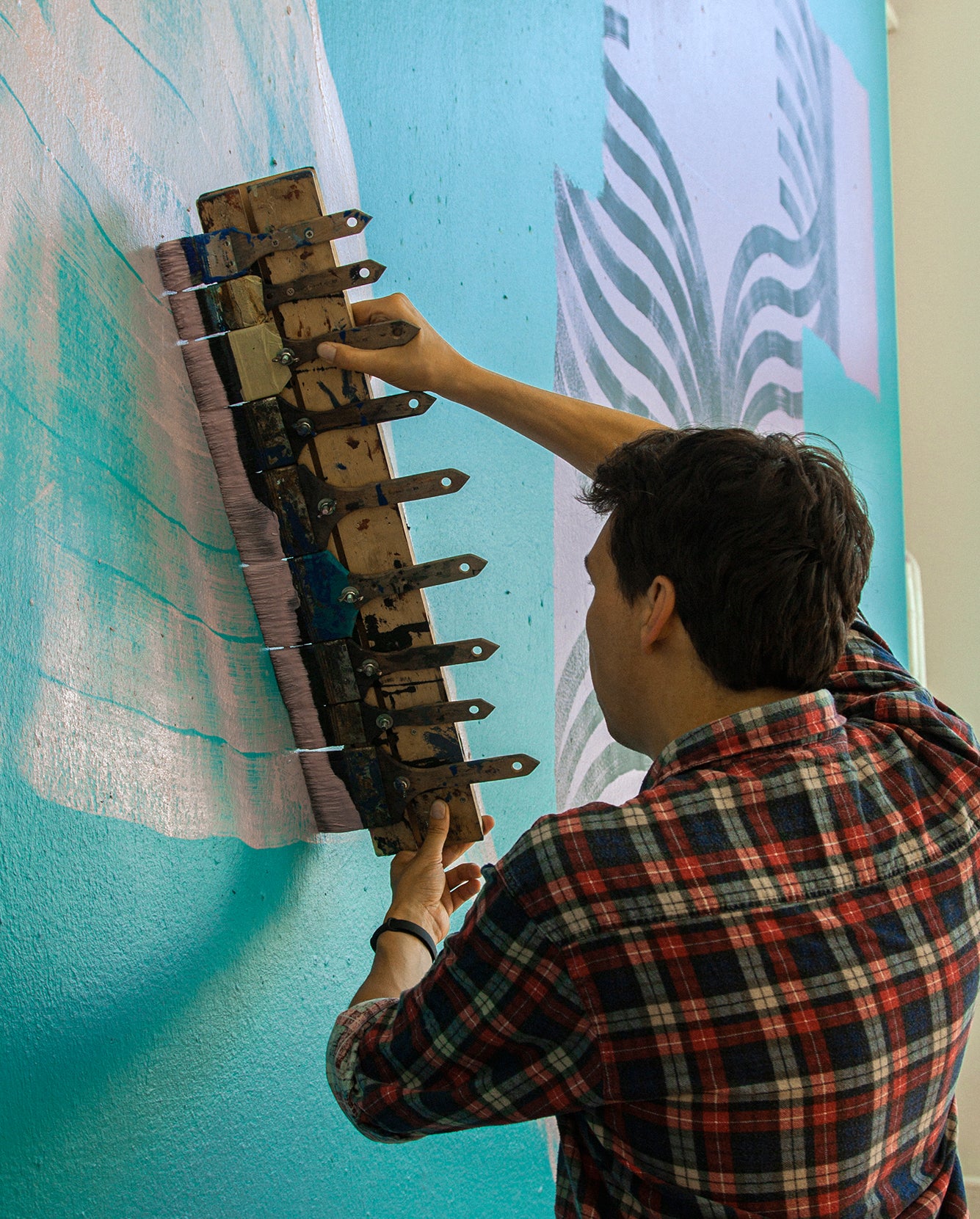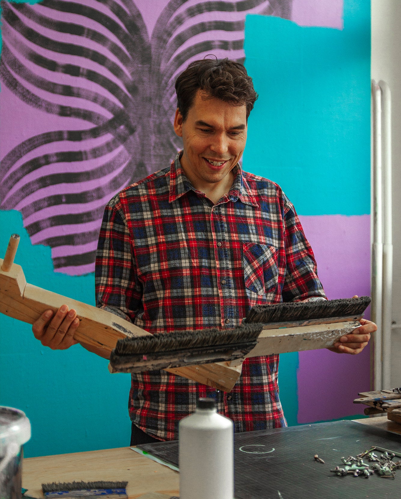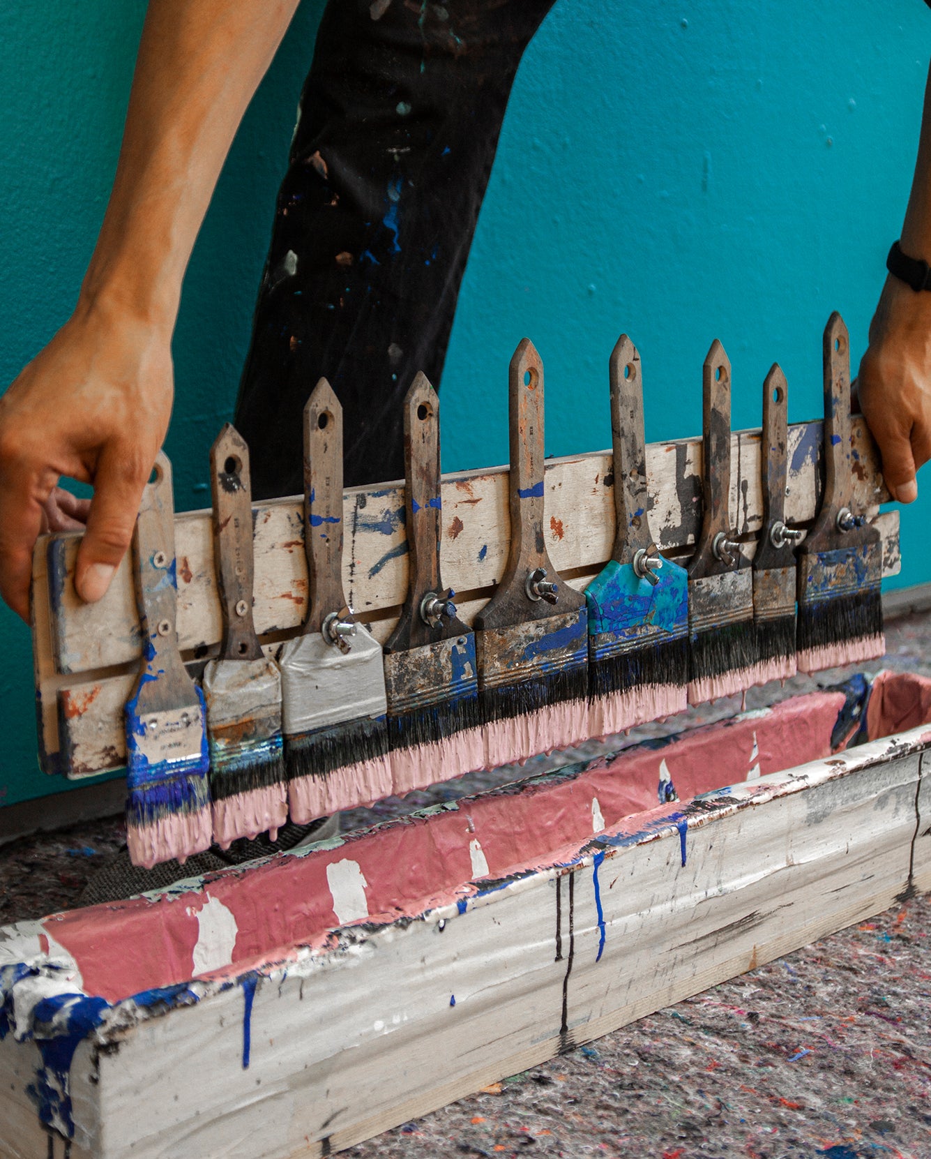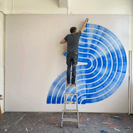 How can you make a large wall surface symmetrical in a short time? Otto Baum asks himself this question over and over again in front of his 3.6x4.5 m studio wall in Berlin and constantly develops new Ottotools from it. In the work "Eight in one stroke" Otto combines eight brushes connected in series with full physical effort and precise handling - the result is a dynamic oval - eight unique brush structures creates the whole in one.
