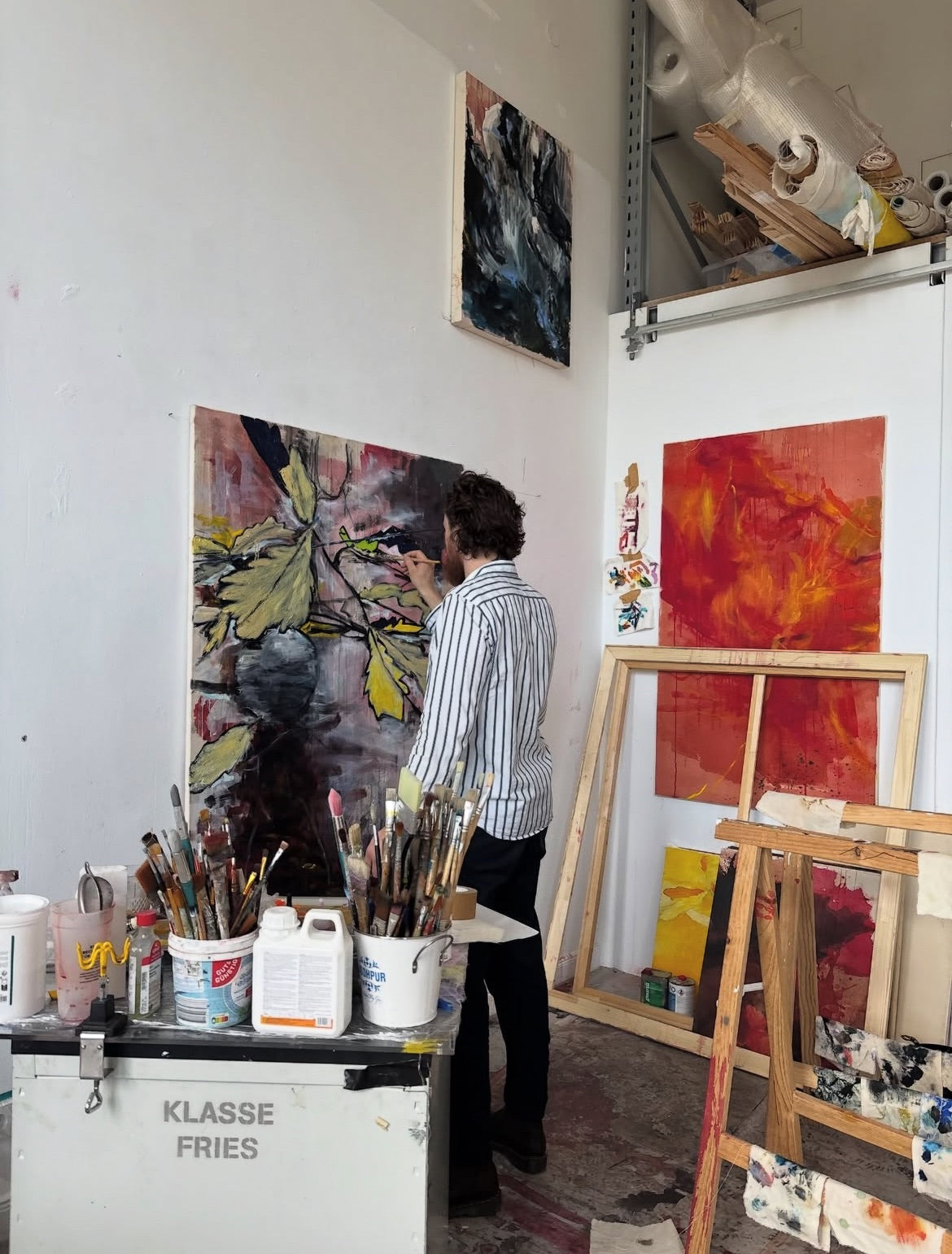 Paul Schönfelder (born 1995) is a Berlin-based painter and student of Fine Arts at the Universität der Künste Berlin. Working with acrylic, charcoal and oil, he creates canvases shaped by contrasts, ruptures and transitions. His practice engages with ambivalent behaviours, inner tensions and the opposites that define human thought and action.