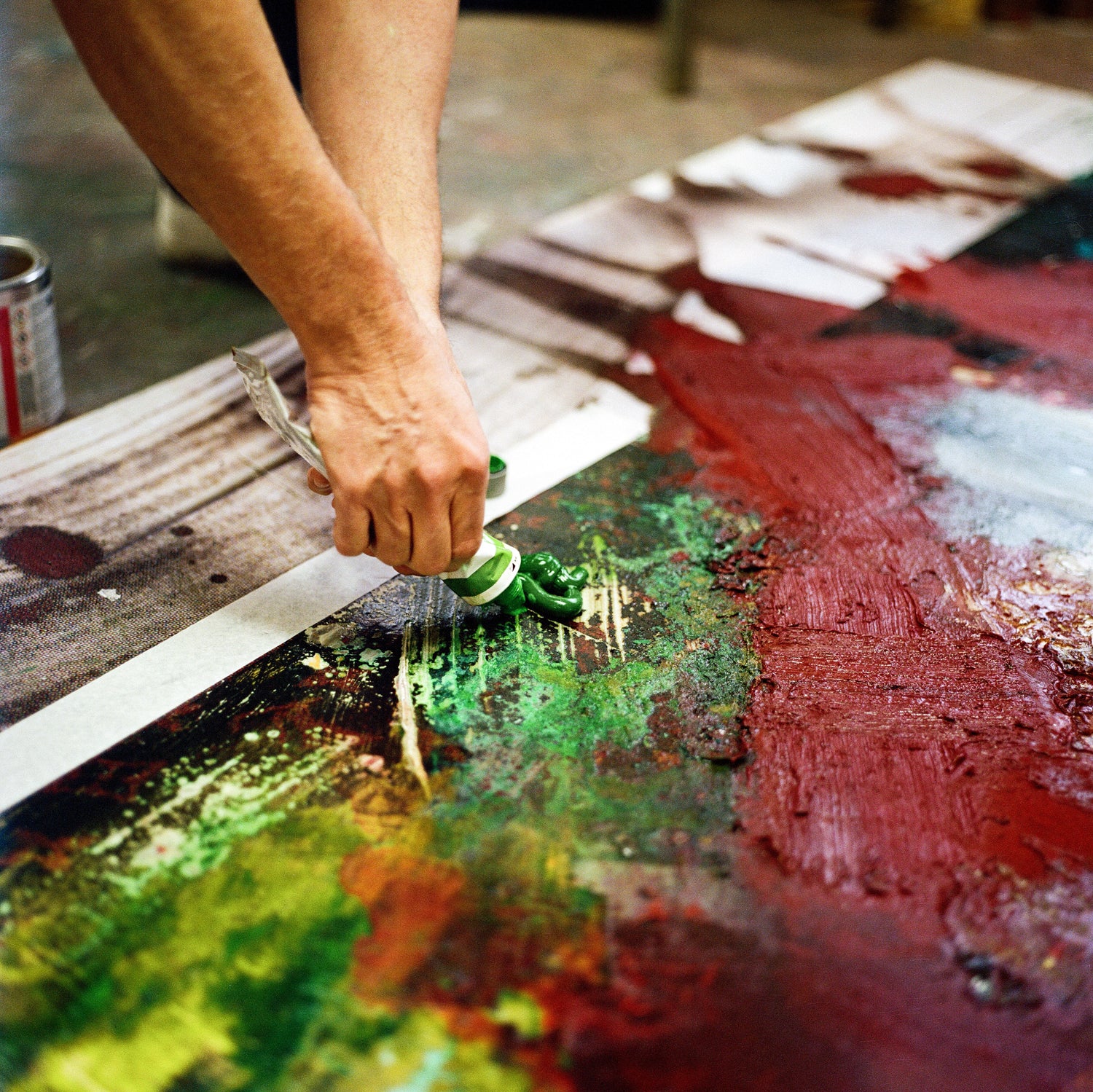 Peter Vahlefeld’s work has always been about the intricacies of transformation. He describes his paintings as reflecting the ways in which we perceive an oversaturated mass media reality. He uses printed matter as key components of his canvases and juxtaposes them with savage scenarios constructed by oil paint. The work conveys a certain tension between the plasticity of paint and the flatness of prints, held together by shiny, glossy or matte mediums. Keyed-up color and almost gridlike compositions point to the readability, immediacy, and graphic presence of our popular culture. By concentrating more on process rather than subject matter, the act of painting becomes Vahlefeld’s primary focus.