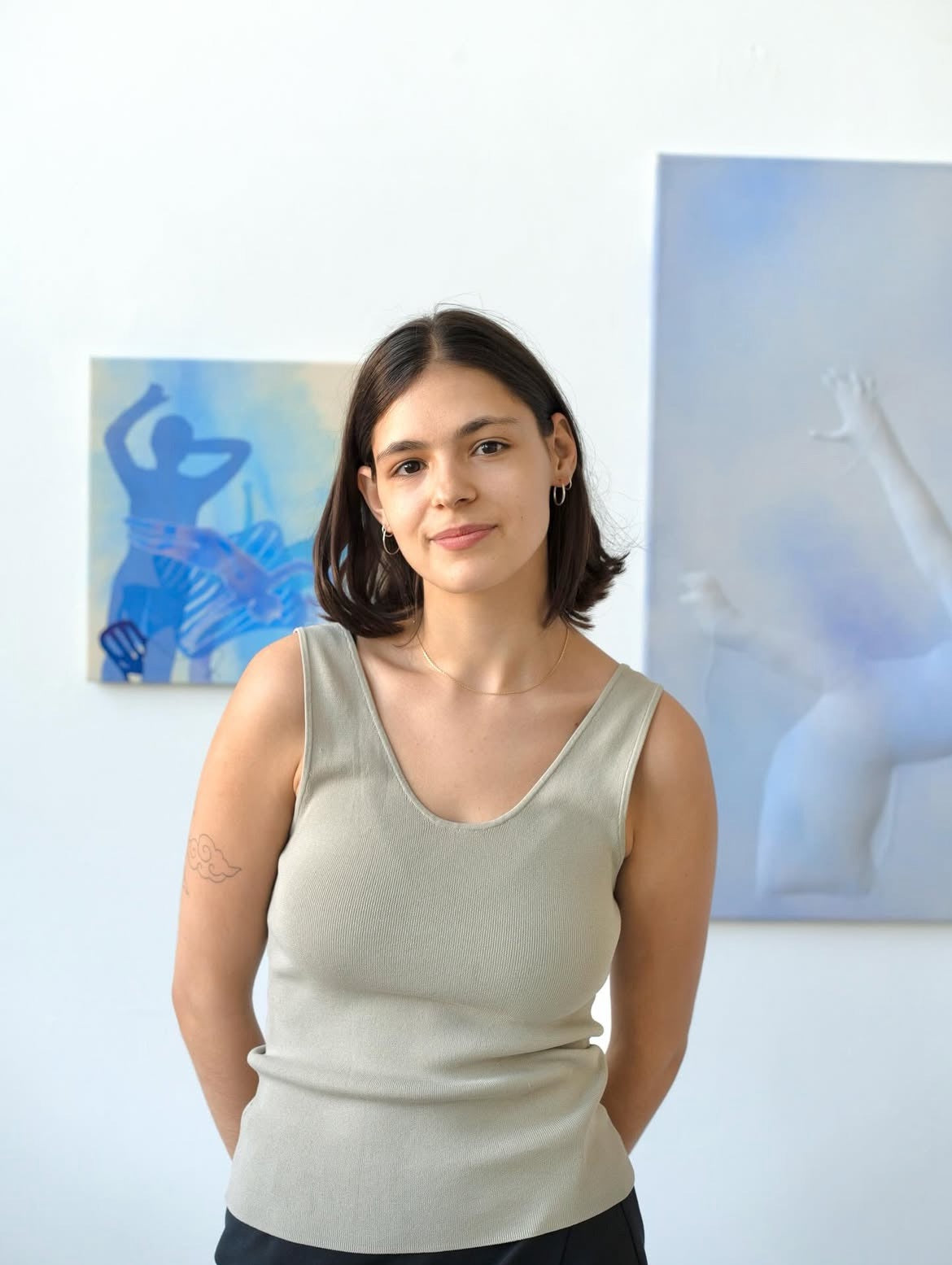 Sophia Wilm works with the soak-stain technique, allowing diluted paint to seep into untreated canvas and build up in translucent layers. Her recent series introduces relief-like, slightly distorted stuffed figures that seem to emerge from the canvas. Inspired by dance, Wilm seeks to capture its dreamlike atmosphere and powerful sense of immersion.