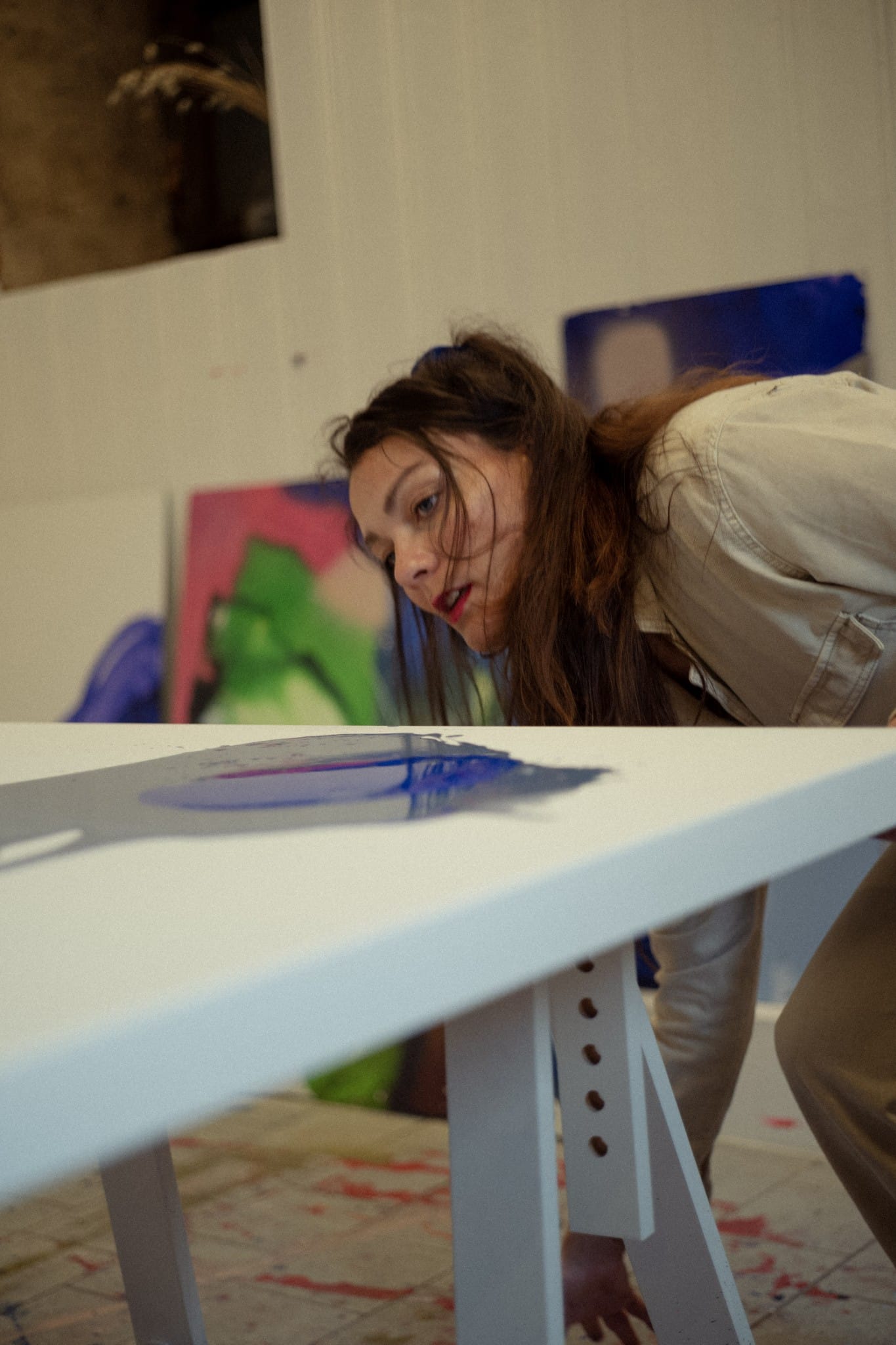 Stefanie Adis (born in 1988) works with different media, brush, spatula, pen, slider, foil. She pours ink or liquid acrylic paint onto plates and lets the paint dry. Chance always decides. After all, the liquid colors should flow without Adis having a concrete effect. This creates an interplay of coincidence and intention, of structure and chaos, of process and completion. Adis studied art education and cultural journalism at the Universität der Künste in Berlin and had exhibitions in Europe.