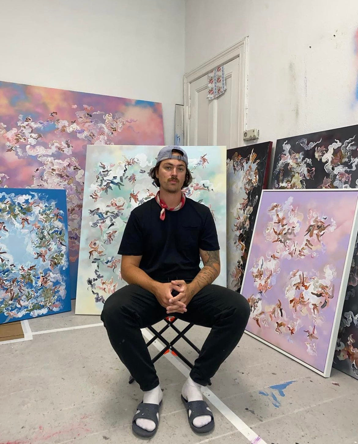 "In my series ‘Modern Fresco’ I combine 2 styles from different artistic epochs. In the style of abstract expressionism, I try to depict monumental scenes of the heavens and gods, reminding the viewer of classical ceiling frescoes from the Baroque period. I only hint at the actual scene, such as the bodies or faces, in order to confront the viewer with their own creativity."