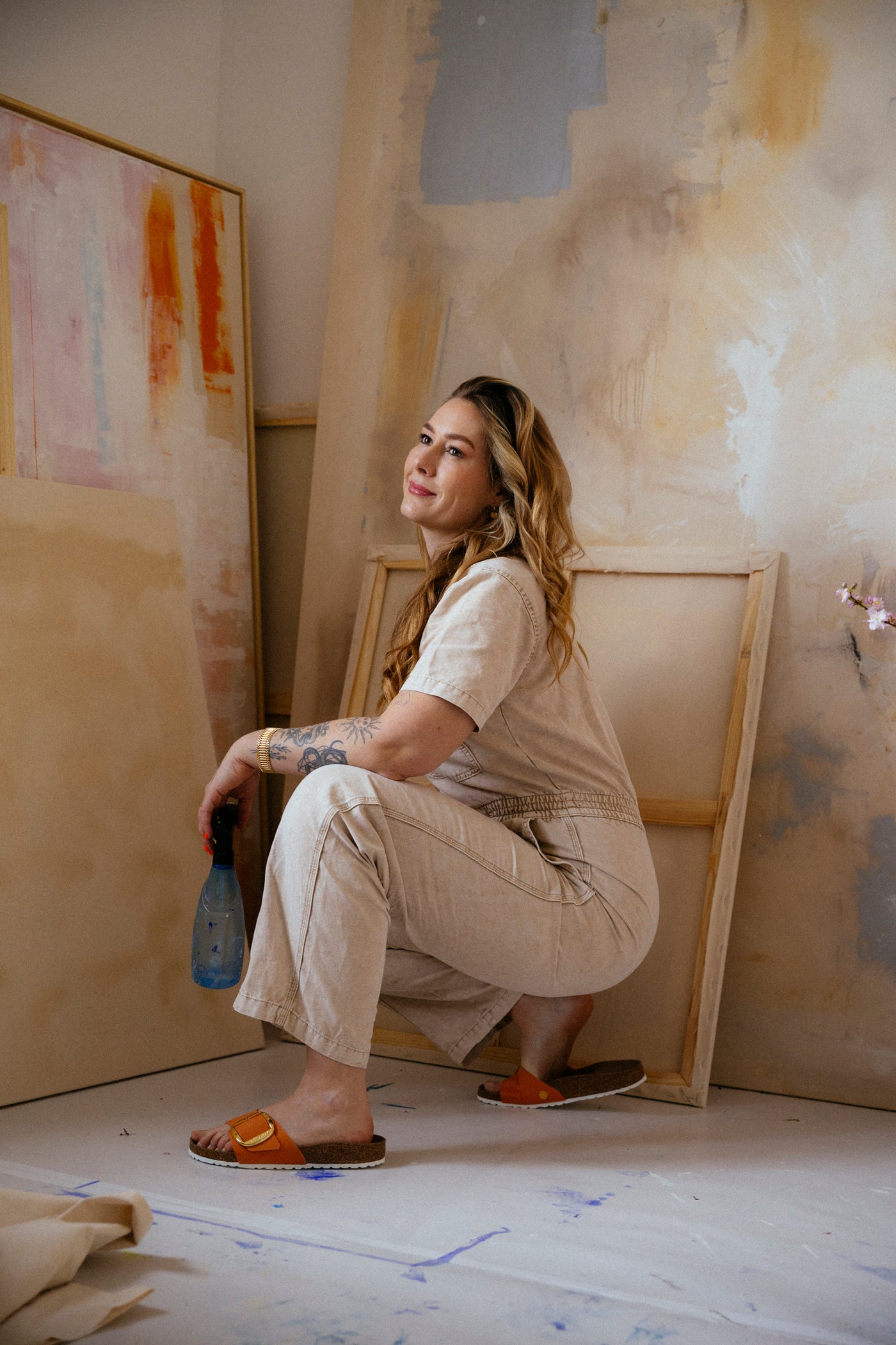 Ronja Chlebowski is a Berlin-based artist whose abstract works blend tranquility with refined aesthetics. Created on raw cotton, her pieces explore delicate textures and vibrant colors, forming visual compositions that are both calming and inspiring. Depending on the light and viewing angle, her artworks continuously reveal new facets and respond subtly to their surroundings.
