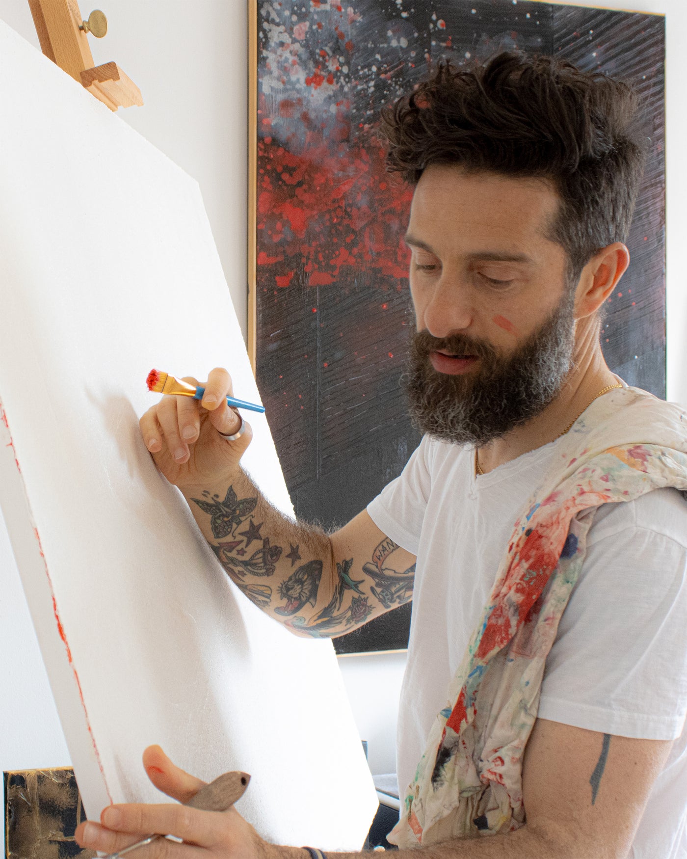 "untitled [black, red & white]" Painting, spray paint, enamel and acrylic on repurposed canvas, framed, 2022, signed by the artist